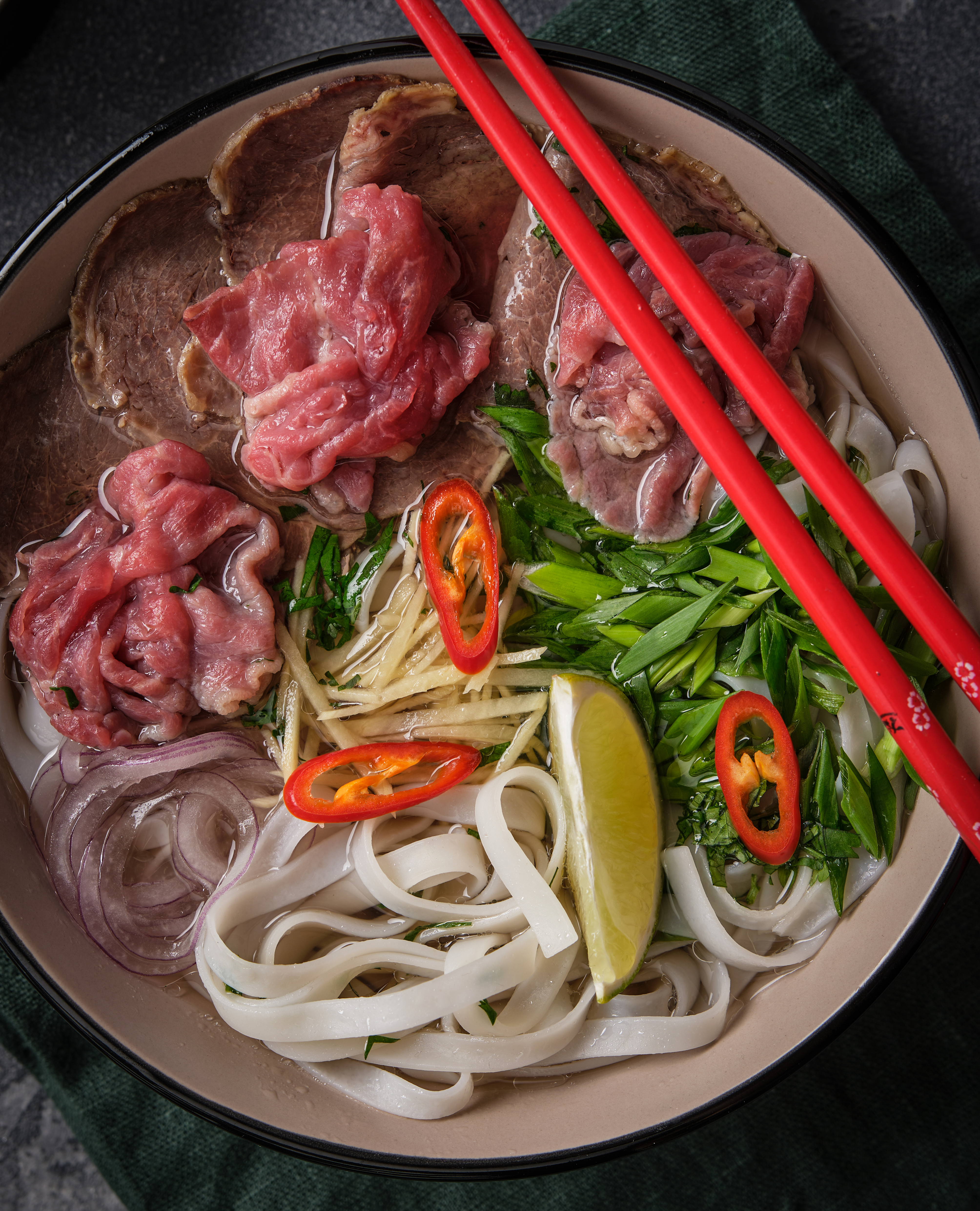 It’s often topped with herbs and bean sprouts.